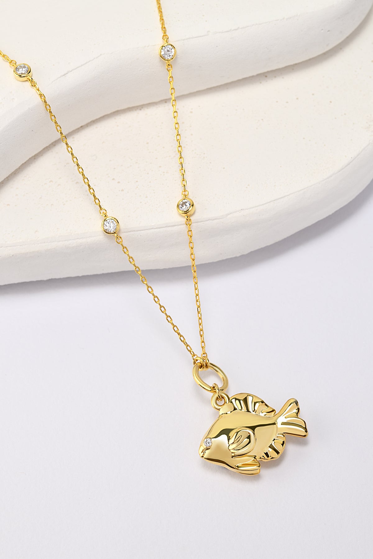 925 Ayar Gümüş Üzeri 18K Altın Kaplama Balık Kolye – Taş Detaylı, Zarif Zincir