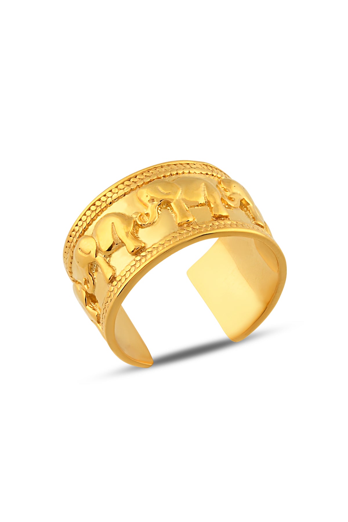 Doğu kültürlerinde bolluk, şans ve koruma sembolü olarak bilinen fil motifi, bu yüzükte 925 ayar gerçek gümüş üzerine 18K altın kaplama ile kabartma olarak işlenmiştir. Parlak altın görünümü ve detaylı işçiliği ile hem zarif hem de karakterli bir görünüm sunar. Açık form tasarımı sayesinde farklı parmak ölçülerine uyum sağlar.